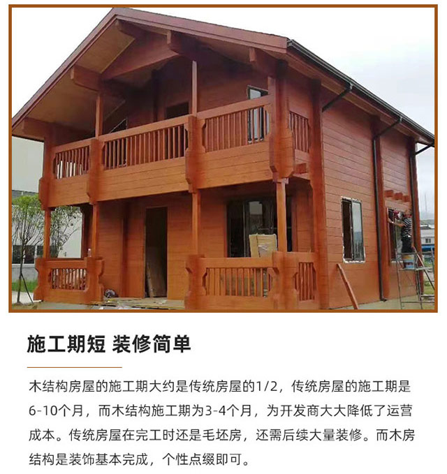 • 木結(jié)構(gòu)房屋的施工期大約是傳統(tǒng)房屋的1/2,傳統(tǒng)房屋的施工期是 6-10個(gè)月,而木結(jié)構(gòu)施工期為3-4個(gè)月,為開發(fā)商大大降低了運(yùn)營 成本。傳統(tǒng)房屋在完工時(shí)還是毛坯房,還需后續(xù)大量裝修。而木房 結(jié)構(gòu)是裝飾基本完成,個(gè)性點(diǎn)綴即可。